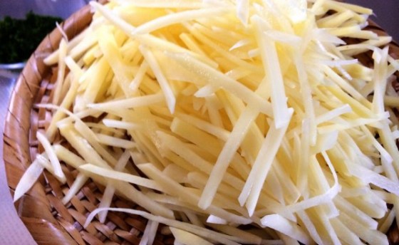 ①じゃがいもは皮をむき2ミリ位の千切りにし、水にさらす。シャキッとした仕上がりにしたいので何度かザルにあげ水をかえる。