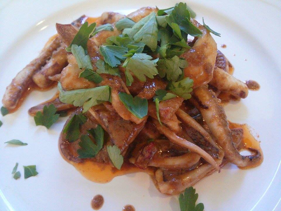 ④イカ・種をとって輪切りにした赤唐辛子を加え強火で炒める。 ワタを入れて絡ませ、白ワイン・レモン汁・塩・コショウで味を整え、イタリアンパセリをのせて完成。