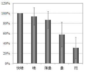 快晴時のUVインデックスを100%とした場合の天気毎のUVインデックスの割合「雲が全くないと仮定した場合のUVインデックスの推定値」に対する「観測されたUVインデックス」の天気毎の割合。 札幌、つくば、鹿児島、那覇で1997~2010年(鹿児島は1997年~2005年3月)に観測されたUVインデックスを用いて作成。 ばらつきの範囲(平均値±標準偏差)を縦線で示す。
